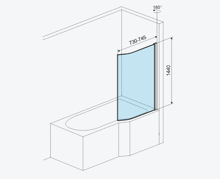 Konstrukcja składa się ze ścianki z giętego szkła o długości 730mm obudowanej w chromowanych profilach. Dzięki unoszonemu zawiasowi, którego zakres ruchu to 180 stopni, z łatwością złożymy parawan do środka lub na zewnątrz wanny. Dostępne są dwie wersje parawanu – lewa lub prawa.