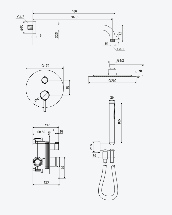 Zestaw podtynkowy PI składa się z baterii prysznicowo-wannowej, deszczownicy górnej oraz zestawu punktowego. Bateria prysznicowo-wannowa podtynkowa serii Pi posiada Fix-Box, który ułatwia instalację baterii oraz zapewnia stały dostęp rewizyjny do mechanizmu baterii. Mechaniczny przełącznik funkcji pozwala na wygodny wybór wypływu wody. Głowica okrągła 200mm z ramieniem kwadratowym może być instalowana na wybranej wysokości, a zestaw punktowy będzie idealnym rozwiązaniem dla użytkowników, którzy nie chcą moczyć włosów podczas krótkiej kąpieli.