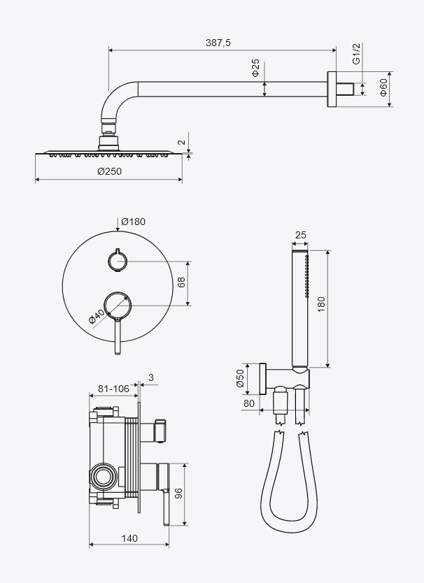 Głowica okrągła 250mm z ramieniem okrągłym może być instalowana na wybranej wysokości, a zestaw punktowy będzie idealnym rozwiązaniem dla użytkowników, którzy nie chcą moczyć włosów podczas krótkiej kąpieli.